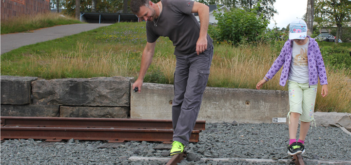 Balansera på riktig tågräls! En liten och en stor rälsbit utanför Minivärlden Ljungby är en rolig utmaning!