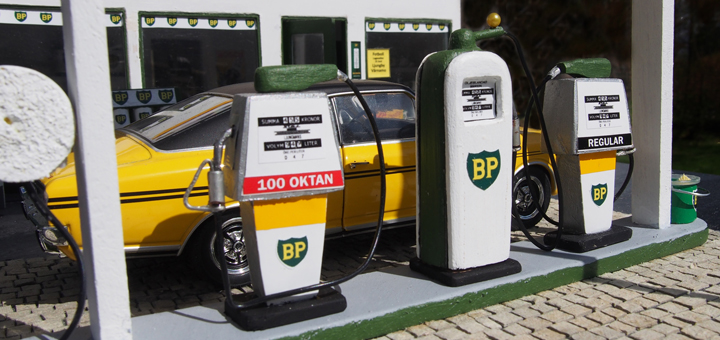 Modellen visar verksamheten en hektisk dag 1977. Då var Alf Germundsson föreståndare. BP slutade sälja bensin i Sverige 1994 och denna mack blev då Statoil-mack.