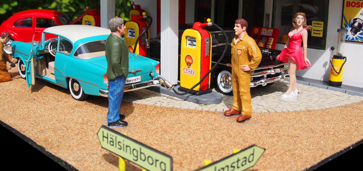 Modellen visar verksamheten en sommardag 1958. VM i fotboll pågick för fullt på Göteborgs stolthet, Nya Ullevi. Vid bensinpumpen ser vi, i elegant vit trenchcoat och svart hatt, den kände göteborgaren Sten-Åke Cederhök tanka sin röda VW bubbla. Han har nyligen blivit chef på Lisebergsteatern.